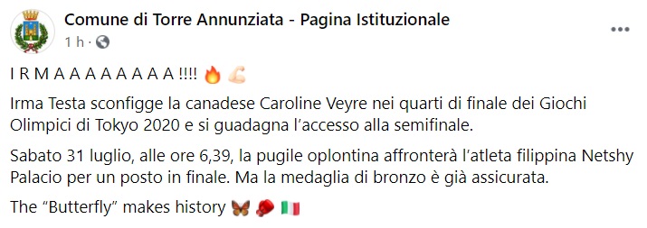 Questo quanto apprendiamo dalla pagina fb del Comune di T.Annunziata: "I R M A A A A A A A A !!!! Irma Testa sconfigge la canadese Caroline Veyre nei quarti di finale dei Giochi Olimpici di Tokyo 2020 e si guadagna l’accesso alla semifinale - si legge nella nota -. Sabato 31 luglio, alle ore 6,39, la pugile oplontina affronterà l’atleta filippina Netshy Palacio per un posto in finale. Ma la medaglia di bronzo è già assicurata. The “Butterfly” makes history"