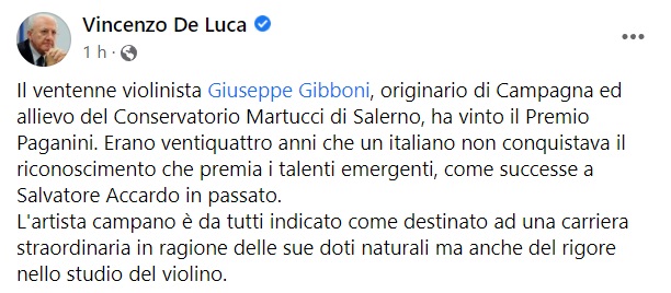 "Il ventenne violinista Giuseppe Gibboni, originario di Campagna ed allievo del Conservatorio Martucci di Salerno, ha vinto il Premio Paganini. Erano ventiquattro anni che un italiano non conquistava il riconoscimento che premia i talenti emergenti, come successe a Salvatore Accardo in passato. -Si legge nella nota- L'artista campano è da tutti indicato come destinato ad una carriera straordinaria in ragione delle sue doti naturali ma anche del rigore nello studio del violino."