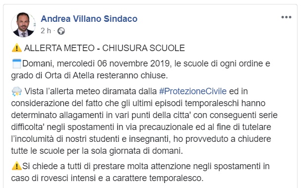 Questo quanto apprendiamo dalla pagina FB del Sindaco Villano