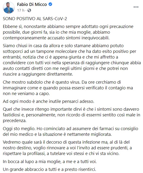 Questo quanto apprendiamo dalla pagina fb del Senatore del M5S di Orta di Atella Fabio Di Micco: "SONO POSITIVO AL SARS-CoV-2 Ebbene sì, nonostante abbiamo sempre adottato ogni precauzione possibile, due giorni fa, sia io che mia moglie - si legge nella nota -, abbiamo contemporaneamente accusato sintomi inequivocabili. Siamo chiusi in casa da allora e solo stamane abbiamo potuto sottoporci ad un tampone molecolare che ha dato esito positivo per entrambi, notizia che ci è appena giunta e che mi affretto a condividere con tutti voi nella speranza di raggiungere chiunque abbia avuto contatti diretti con me negli ultimi giorni - si legge nella nota - e che potrei non riuscire a raggiungere direttamente. Che mostro subdolo che è questo virus. Da ore cerchiamo di immaginare come e quando possa essersi verificato il contagio ma non ne veniamo a capo. Ad ogni modo è anche inutile pensarci adesso. Quel che invece ritengo importante dirvi è che i sintomi sono davvero fastidiosi e, personalmente, non ricordo di essermi sentito così male in precedenza - si legge nella nota -. Oggi sto meglio. Ho cominciato ad assumere dei farmaci su consiglio del mio medico e la situazione è nettamente migliorata. Vedremo quale sarà il decorso di questa infezione ma, al di là del nostro destino, voglio rinnovare a voi l’invito ad essere prudenti, a rispettare la profilassi, a tutelare voi stessi e chi vi sta vicino. In bocca al lupo a mia moglie, a me e a tutti voi - si legge nella nota -. Un grande abbraccio a tutti e a presto risentirci."
