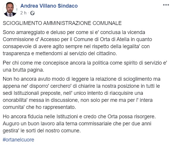 Sono amareggiato e deluso per come si e' conclusa la vicenda Commissione d' Accesso per il Comune di Orta di Atella in quanto consapevole di avere agito sempre nel rispetto della legalita' con trasparenza e mettendomi al servizio del cittadino. Per chi come me concepisce ancora la politica come spirito di servizio e' una brutta pagina. Non ho ancora avuto modo di leggere la relazione di scioglimento ma appena ne' disporro' cerchero' di chiarire la nostra posizione in tutti le sedi Istituzionali preposte, nell' unico intento di riacquisire una onorabilita' messa in discussione, non solo per me ma per l' intera comunita' che ho rappresentato. Ho ancora fiducia nelle Istituzioni e credo che Orta possa risorgere. Auguro un buon lavoro alla terna commissariale che per due anni gestira' le sorti del nostro comune."
