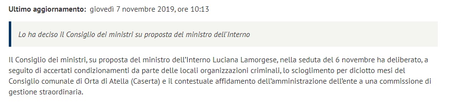 "Il Consiglio dei ministri, su proposta del ministro dell’Interno Luciana Lamorgese, nella seduta del 6 novembre ha deliberato, a seguito di accertati condizionamenti da parte delle locali organizzazioni criminali, lo scioglimento per diciotto mesi del Consiglio comunale di Orta di Atella (Caserta) e il contestuale affidamento dell’amministrazione dell’ente a una commissione di gestione straordinaria."