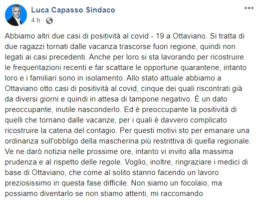 Questo quanto pubblicato sulla pagina facebook del Sindaco Capasso:
