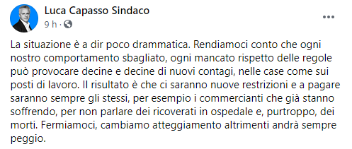 Questo il post pubblicato dal Sindaco di Ottaviano Luca Capasso sulla sua pagina Facebook: "La situazione è a dir poco drammatica. Rendiamoci conto che ogni nostro comportamento sbagliato, ogni mancato rispetto delle regole può provocare decine e decine di nuovi contagi, nelle case come sui posti di lavoro. Il risultato - prosegue il Sindaco nel post - è che ci saranno nuove restrizioni e a pagare saranno sempre gli stessi, per esempio i commercianti che già stanno soffrendo, per non parlare dei ricoverati in ospedale e, purtroppo, dei morti. Fermiamoci - conclude il Sindaco - cambiamo atteggiamento altrimenti andrà sempre peggio".