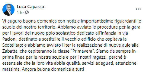 Questo il post pubblicato sulla sua pagina Facebook dal Sindaco di Ottaviano Luca Capasso: "Vi auguro buona domenica con notizie importantissime riguardanti le scuole del nostro territorio. Abbiamo avviato - si legge nel post - le procedure per la gara per i lavori del nuovo polo scolastico dedicato all'infanzia in via Pacioni, destinato a sostituire il vecchio edificio che ospitava la Scotellaro; e abbiamo avviato l’iter la realizzazione di nuove aule alla Zabatta, che ospiteranno la classe “Primavera”. Siamo da sempre in prima linea - prosegue il post - per le nostre scuole e per i nostri ragazzi, perché è essenziale che la loro vita abbia qualità, servizi adeguati, attenzione massima. Ancora buona domenica a tutti".