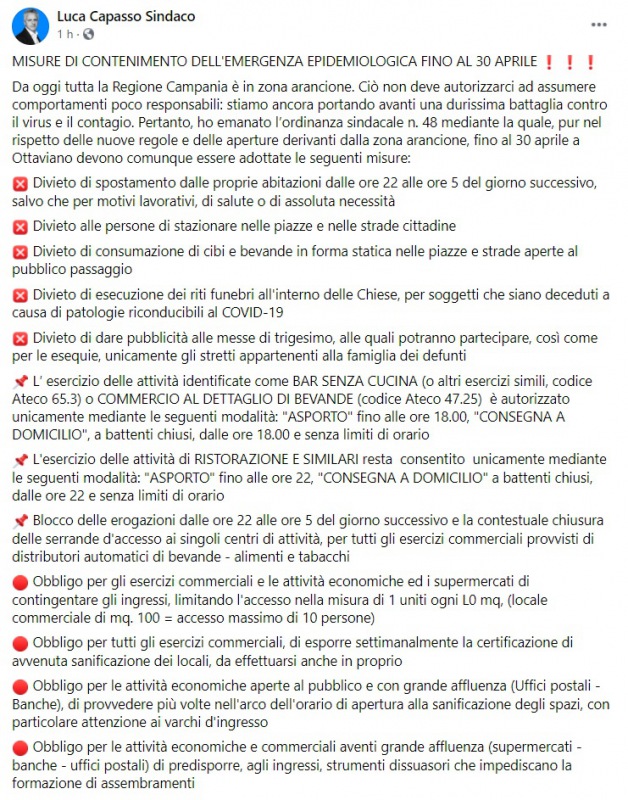 "Da oggi tutta la Regione Campania è in zona arancione. Ciò non deve autorizzarci ad assumere comportamenti poco responsabili: stiamo ancora portando avanti una durissima battaglia contro il virus e il contagio. Pertanto, ho emanato l’ordinanza sindacale n. 48 mediante la quale, pur nel rispetto delle nuove regole e delle aperture derivanti dalla zona arancione, fino al 30 aprile a Ottaviano devono comunque essere adottate le seguenti misure: Divieto di spostamento dalle proprie abitazioni dalle ore 22 alle ore 5 del giorno successivo, salvo che per motivi lavorativi, di salute o di assoluta necessità; -si legge nella nota- Divieto alle persone di stazionare nelle piazze e nelle strade cittadine; Divieto di consumazione di cibi e bevande in forma statica nelle piazze e strade aperte al pubblico passaggio; Divieto di esecuzione dei riti funebri all'interno delle Chiese, per soggetti che siano deceduti a causa di patologie riconducibili al COVID-19; Divieto di dare pubblicità alle messe di trigesimo, alle quali potranno partecipare, così come per le esequie, unicamente gli stretti appartenenti alla famiglia dei defunti. -Si legge nella nota- L′ esercizio delle attività identificate come BAR SENZA CUCINA (o altri esercizi simili, codice Ateco 65.3) o COMMERCIO AL DETTAGLIO DI BEVANDE (codice Ateco 47.25) è autorizzato unicamente mediante le seguenti modalità: "ASPORTO" fino alle ore 18.00, "CONSEGNA A DOMICILIO", a battenti chiusi, dalle ore 18.00 e senza limiti di orario. L'esercizio delle attività di RISTORAZIONE E SIMILARI resta consentito unicamente mediante le seguenti modalità: "ASPORTO" fino alle ore 22, "CONSEGNA A DOMICILIO" a battenti chiusi, dalle ore 22 e senza limiti di orario. Blocco delle erogazioni dalle ore 22 alle ore 5 del giorno successivo e la contestuale chiusura delle serrande d'accesso ai singoli centri di attività, per tutti gli esercizi commerciali provvisti di distributori automatici di bevande - alimenti e tabacchi; -si legge nella nota- Obbligo per gli esercizi commerciali e le attività economiche ed i supermercati di contingentare gli ingressi, limitando l'accesso nella misura di 1 uniti ogni L0 mq, (locale commerciale di mq. 100 = accesso massimo di 10 persone); Obbligo per tutti gli esercizi commerciali, di esporre settimanalmente la certificazione di avvenuta sanificazione dei locali, da effettuarsi anche in proprio; Obbligo per le attività economiche aperte al pubblico e con grande affluenza (Uffici postali - Banche), di provvedere più volte nell'arco dell'orario di apertura alla sanificazione degli spazi, con particolare attenzione ai varchi d'ingresso; Obbligo per le attività economiche e commerciali aventi grande affluenza (supermercati - banche - uffici postali) di predisporre, agli ingressi, strumenti dissuasori che impediscano la formazione di assembramenti"