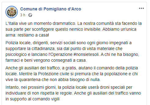 "L'Italia vive un momento drammatico. La nostra comunità sta facendo la sua parte per sconfiggere questo nemico invisibile. Abbiamo un'unica arma: restiamo a casa! Polizia locale, dirigenti, servizi sociali sono ogni giorno impegnati a supportare la cittadinanza, sia dal punto di vista materiale che psicologico e lanciano l'Operazione #nonsietesoli. A chi ne ha bisogno, farmaci e beni vengono consegnati a casa. Anche gli ausiliari del traffico, a gratis, aiutano il comando della polizia locale. Mentre la Protezione civile si premura che la popolazione e chi vive la quarantena che non abbia bisogno di nulla. Intanto, nei prossimi giorni, la polizia locale userà droni speciali per individuare di non rispetta le regole. Anche gli ausiliari del traffico vanno in supporto al comando vigili".