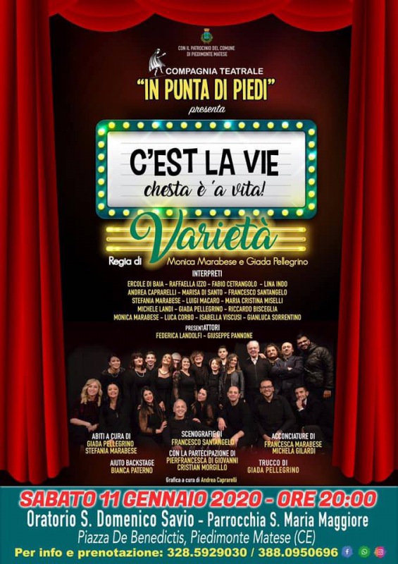 "In punta di piedi. Si accostano al teatro proprio così, ecco spiegato il nome della Compagnia Teatrale. Non sono attori protagonisti ma protagonisti della loro passione, dei loro talenti, della loro voglia di stare insieme e di condividere momenti che vanno oltre le prove, i copioni e il sipario. Ecco il segreto della giovialità, -spiega la nota-dell'entusiasmo e della gioia che caratterizza il gruppo teatrale “In punta di piedi” di Piedimonte Matese (CE), una compagnia che sarà in scena il prossimo 11 gennaio alle ore 20:00 presso l'Oratorio San Domenico Savio (Parrocchia S. Maria Maggiore) in piazza De Benedictis del capoluogo matesino.-spiega la nota-Dopo la tre giorni chiusa con successo a San Potito, con il patrocinio dell'Amministrazione Comunale pedemontana sarà riproposto il Varietà "C'est la Vie, chesta è 'a vita", quello che le ideatrici e registe Giada Pellegrini e Monica Marabese definiscono una 'scommessa'. -spiega la nota-Un vero e proprio spettacolo teatrale pensato e strutturato per l’intrattenimento delle più ampie fasce di età, un contenitore di stralci di commedie, musica, scenette umoristiche e interazione con il pubblico che ha convinto i numerosissimi appassionati che lo hanno già visto.-spiega la nota- "Un varietà che ci ha messi alla prova moltissimo - dichiarano Giada e Monica all'unisono - e che al tempo stesso ha regalato a noi una immensa soddisfazione e al pubblico una serata piacevole e divertente in un periodo, quello natalizio, che ben si presta a questo genere di intrattenimento". Uno spettacolo da non perdere,-spiega la nota- con 'presentattori' Federica Landolfi e Giuseppe Pannone, che vedrà impegnati sul palco anche Ercole Di Baia, Raffaella Izzo, Fabio Centrangelo, Lina Indo, Andrea Caprarelli, Marisa Di Santo, Francesco Santangelo, Stefania Marabese, Luigi Macaro, Maria Cristina Miselli, Michele Landi, Riccardo Bisceglia, Luca Corbo, -spiega la nota-Isabella Viscusi, Gianluca Sorrentino, Pierfrancesca Di Giovanni e Christian Morgillo; dietro le quinte saranno all'opera Bianca Paterno, Francesca Marabese, Michela Gilardi e Alfonso Martuscelli.-spiega la nota-Una serata diversa che promette risate e colpi di scena da trascorrere 'in compagnia' del gruppo "In punta di piedi', “del resto - come sostenuto anche a San Potito in occasione del debutto - "non possiamo fare a meno di voi, il teatro non esisterebbe senza il pubblico”..."