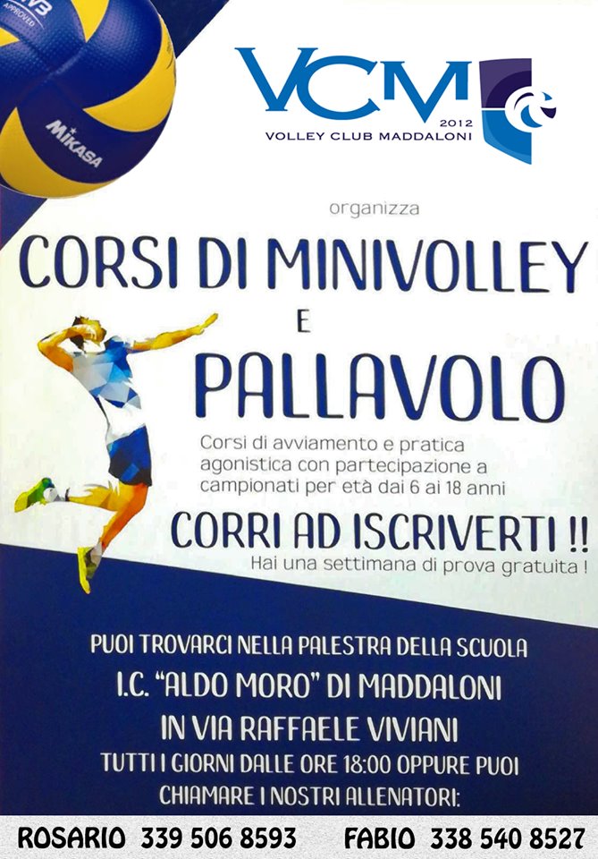 Questo quanto comunicato dal Volley Club Maddaloni: "L'estate sta finendo e la VCM è già qua! La nuova Stagione Pallavolistica 2019/20 è iniziata! CORSI DI MINIVOLLEY & PALLAVOLO, UNA SETTIMANA DI PROVA GRATUITA, DIVERTITI E CONOSCI TANTI NUOVI AMICI! Vienici a Trovare alla scuola "I.C. Aldo Moro" in Via Viviani, Maddaloni dalle ore 18:00 o chiama i nostri allenatori (Rosario 339 506 8593 | Fabio 338 540 8527)".