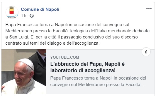Papa Francesco è ritornato questa mattina nella città di Napoli, dichiarando che "la città è laboratorio di accoglienza.