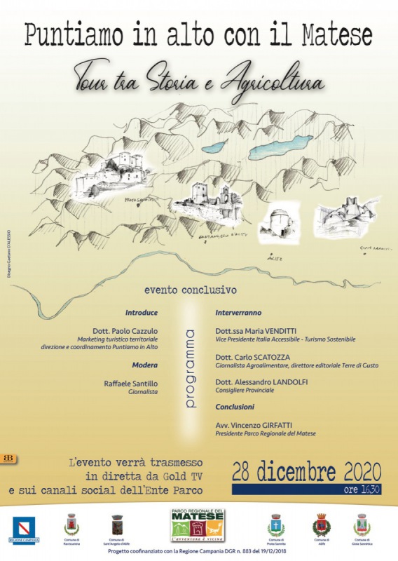 Nella giornata di domani, lunedì 28 dicembre, alle ore 16:30 si terrà l'evento "Puntiamo in alto con il Matese. Tour tra Storia e Agricoltura" che verrà trasmesso in diretta sulla nostra pagina facebook, Gold WebTV, e sui canali social dell'Ente del Parco. Tanti saranno gli interventi, tra i quali quello del Presidente Parco Regionale del Matese, Vincenzo Girfatti.