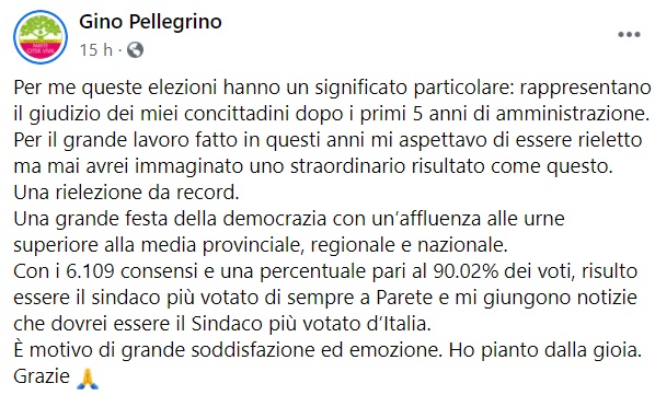 "Per me queste elezioni hanno un significato particolare: rappresentano il giudizio dei miei concittadini dopo i primi 5 anni di amministrazione. Per il grande lavoro fatto in questi anni mi aspettavo di essere rieletto ma mai avrei immaginato uno straordinario risultato come questo. Una rielezione- si legge nella nota- da record. Una grande festa della democrazia con un’affluenza alle urne superiore alla media provinciale, regionale e nazionale. Con i 6.109 consensi e una percentuale pari al 90.02% dei voti, risulto essere il sindaco più votato di sempre a Parete e mi giungono notizie che dovrei essere il Sindaco più votato d’Italia. È motivo- si legge nella nota- di grande soddisfazione ed emozione. Ho pianto dalla gioia. Grazie"