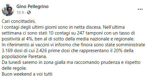 Questo il post pubblicato sulla sua pagina Facebook dal Sindaco di Parete Gino Pellegrino: "Cari concittadini, i contagi degli ultimi giorni sono in netta discesa. Nell’ultima settimana ci sono stati 10 contagi su 247 tamponi con un tasso di positività al 4%, ben al di sotto della media nazionale e regionale. In riferimento ai vaccini - prosegue il Sindaco - vi informo che finora sono state somministrate 3.169 dosi di cui 2.426 prime dosi che rappresentano il 20% della popolazione Paretana. Da lunedì saremo in zona gialla ma raccomando prudenza e - conclude il sindaco - rispetto delle regole. Buon weekend a voi tutti".