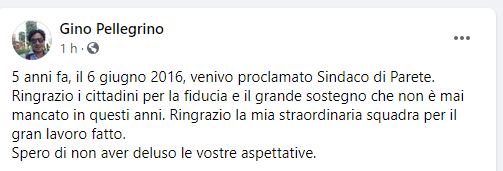 Questo il post pubblicato sulla sua pagina Facebook dal Sindaco di Parete Gino Pellegrino: "5 anni fa, il 6 giugno 2016, venivo proclamato Sindaco di Parete. Ringrazio i cittadini - si legge nel post - per la fiducia e il grande sostegno che non è mai mancato in questi anni. Ringrazio la mia straordinaria squadra per il gran lavoro fatto. Spero - conclude il post - di non aver deluso le vostre aspettative".