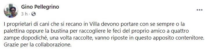 Questo quanto pubblicato dal Sindaco di Parete: "I proprietari di cani che si recano in Villa devono portare con se sempre o la palettina oppure la bustina per raccogliere le feci del proprio amico a quattro zampe dopodiché, una volta raccolte, vanno riposte in questo apposito contenitore. Grazie per la collaborazione."