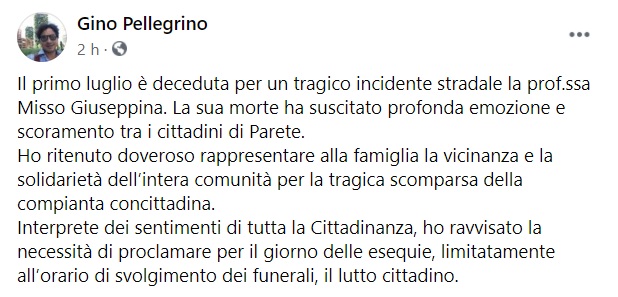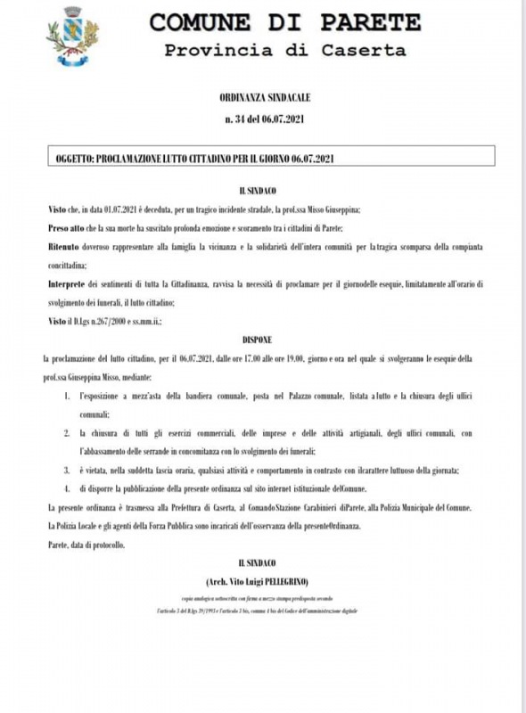 "Il primo luglio è deceduta per un tragico incidente stradale la prof.ssa Misso Giuseppina. La sua morte ha suscitato profonda emozione e scoramento tra i cittadini di Parete. Ho ritenuto doveroso rappresentare alla famiglia la vicinanza e la solidarietà dell’intera comunità per la tragica scomparsa della compianta concittadina. -Si legge nella nota-Interprete dei sentimenti di tutta la Cittadinanza, ho ravvisato la necessità di proclamare per il giorno delle esequie, limitatamente all’orario di svolgimento dei funerali, il lutto cittadino."