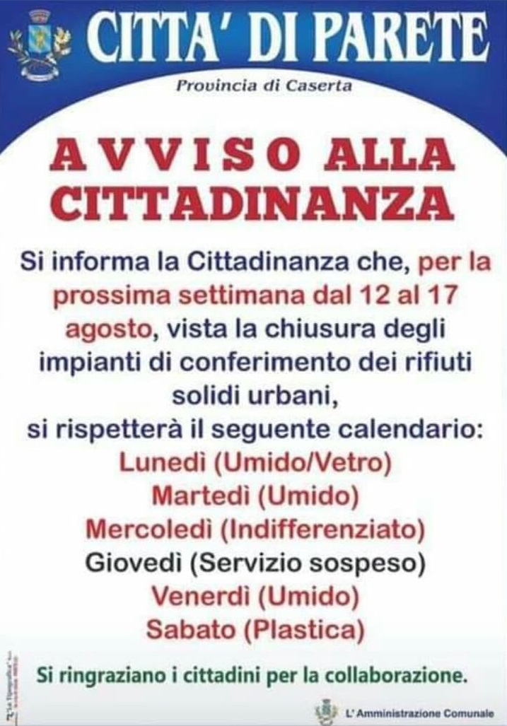 Questo quanto apprendiamo dal manifesto pubblico del Comune di Parete