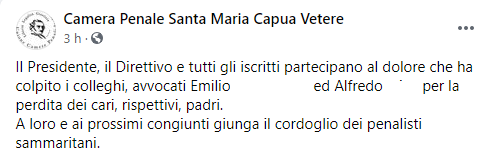 Questo parte dell post pubblicato sulla pagina Faceboo 'Camera penale Santa Maria Capua Vetere': "Il Presidente, il Direttivo e tutti gli iscritti - si legge nel post - partecipano al dolore che ha colpito i colleghi, avvocati Emilio (...) ed Alfredo (...), per la perdita dei cari, rispettivi, padri. A loro e ai prossimi congiunti - conclude il post - giunga il cordoglio dei penalisti sammaritani".