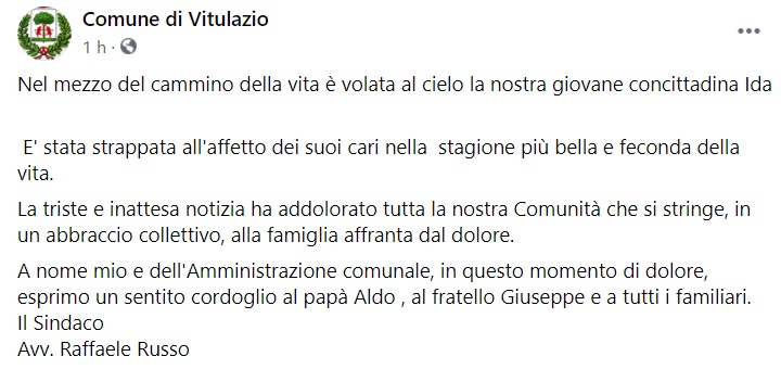 Questo il messaggio di cordoglio che apprendiamo dalla pagina facebook del Comune di Vitulazio: "Nel mezzo del cammino della vita è volata al cielo la nostra giovane concittadina Ida... E' stata strappata all'affetto dei suoi cari nella stagione più bella e feconda della vita. La triste e inattesa notizia ha addolorato tutta la nostra Comunità che si stringe, in un abbraccio collettivo, alla famiglia affranta dal dolore. A nome mio e dell'Amministrazione comunale, in questo momento di dolore, esprimo un sentito cordoglio al papà Aldo , al fratello Giuseppe e a tutti i familiari. Il Sindaco Avv. Raffaele Russo