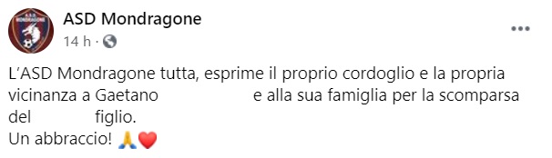 "L’ASD Mondragone tutta, esprime il proprio cordoglio e la propria vicinanza a Gaetano ... e alla sua famiglia- si legge nella nota- per la scomparsa del ... figlio. Un abbraccio!"