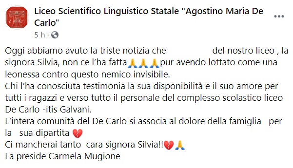 Questo il messaggio di cordoglio che apprendiamo dalla pagina facebook del Liceo Scientifico Linguistico Statale "Agostino Maria De Carlo" di Giugliano in Campania: "Oggi abbiamo avuto la triste notizia che ... del nostro liceo, la signora Silvia, non ce l’ha fatta - si legge nella nota - pur avendo lottato come una leonessa contro questo nemico invisibile. Chi l’ha conosciuta testimonia la sua disponibilità e il suo amore per tutti i ragazzi e verso tutto il personale del complesso scolastico liceo De Carlo-itis Galvani. L’intera comunità del De Carlo si associa al dolore della famiglia per la sua dipartita - si legge nella nota - Ci mancherai tanto cara signora Silvia!! La preside Carmela Mugione"
