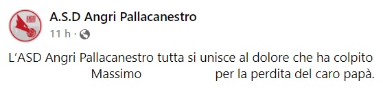 Questo il messaggio di cordoglio che apprendiamo dalla pagina facebook della società Angri Pallacanestro: "L’ASD Angri Pallacanestro tutta si unisce al dolore che ha colpito ... Massimo ... per la perdita del caro papà."