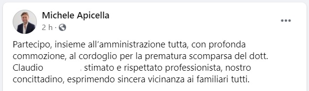 Questo il messaggio di cordoglio che apprendiamo dalla pagina facebook del Sindaco di Trentola Ducenta: "Partecipo, insieme all’amministrazione tutta, con profonda commozione, al cordoglio - si legge nella nota - per la prematura scomparsa del dott. Claudio ..., stimato e rispettato professionista, nostro concittadino, esprimendo sincera vicinanza ai familiari tutti."