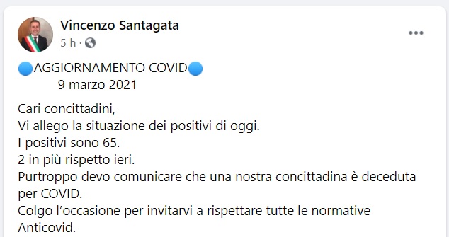 Questo il messaggio di cordoglio che apprendiamo dalla pagina facebook del Sindaco di Gricignano, Vincenzo Santagata: "AGGIORNAMENTO COVID 9 marzo 2021 Cari concittadini, Vi allego la situazione dei positivi di oggi. I positivi sono 65. 2 in più rispetto ieri - si legge nella nota -. Purtroppo devo comunicare che una nostra concittadina è deceduta per COVID. Colgo l’occasione per invitarvi a rispettare tutte le normative Anticovid."