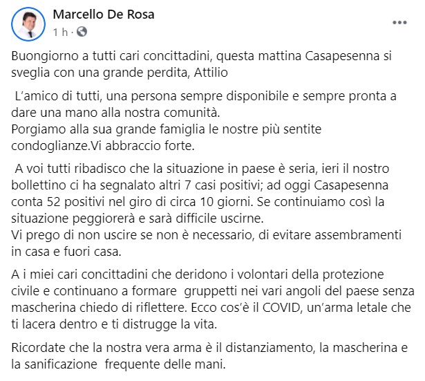 "Buongiorno a tutti cari concittadini, questa mattina Casapesenna si sveglia con una grande perdita, Attilio ... L’amico di tutti, una persona sempre disponibile e sempre pronta a dare una mano alla nostra comunità. Porgiamo alla sua grande famiglia le nostre più sentite condoglianze.Vi abbraccio forte. -Si legge nella nota- A voi tutti ribadisco che la situazione in paese è seria, ieri il nostro bollettino ci ha segnalato altri 7 casi positivi; ad oggi Casapesenna conta 52 positivi nel giro di circa 10 giorni. Se continuiamo così la situazione peggiorerà e sarà difficile uscirne. Vi prego di non uscire se non è necessario, di evitare assembramenti in casa e fuori casa. A i miei cari concittadini che deridono i volontari della protezione civile e continuano a formare gruppetti nei vari angoli del paese senza mascherina chiedo di riflettere. -Si legge nella nota- Ecco cos’è il COVID, un’arma letale che ti lacera dentro e ti distrugge la vita. Ricordate che la nostra vera arma è il distanziamento, la mascherina e la sanificazione frequente delle mani."
