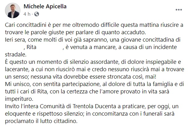 "Cari concittadini è per me oltremodo difficile questa mattina riuscire a trovare le parole giuste per parlare di quanto accaduto. Ieri sera, come molti di voi già sapranno, una giovane concittadina di ... , Rita ... , è venuta a mancare, a causa di un incidente stradale. -Si legge nella nota- È questo un momento di silenzio assordante, di dolore inspiegabile e lacerante, a cui non riuscirò mai e credo nessuno riuscirà mai a trovare un senso; nessuna vita dovrebbe essere stroncata così, mai! -Si legge nella nota- Mi unisco, con sentita partecipazione, al dolore di tutta la famiglia e di tutti i cari di Rita, con la certezza che l’amore provato in vita sarà imperituro. Invito l’intera Comunità di Trentola Ducenta a praticare, per oggi, un eloquente e rispettoso silenzio; in concomitanza con i funerali sarà proclamato il lutto cittadino."