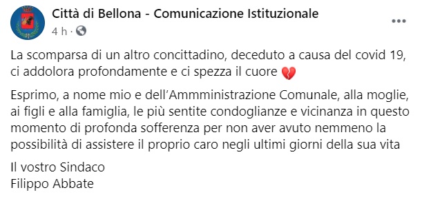 Questo il messaggio di cordoglio che apprendiamo dalla pagina facebook del Comune di Bellona: "La scomparsa di un altro concittadino, deceduto a causa del covid 19, ci addolora profondamente e ci spezza il cuore - si legge nella nota - Esprimo, a nome mio e dell’Ammministrazione Comunale, alla moglie, ai figli e alla famiglia, le più sentite condoglianze e vicinanza in questo momento di profonda sofferenza per non aver avuto nemmeno la possibilità di assistere il proprio caro negli ultimi giorni della sua vita Il vostro Sindaco Filippo Abbate".