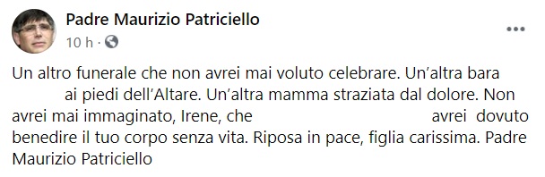Questo il messaggio di cordoglio che apprendiamo dalla pagina facebook di Padre Maurizio Patriciello: "Un altro funerale che non avrei mai voluto celebrare. Un’altra bara ... ai piedi dell’Altare. Un’altra mamma straziata dal dolore. Non avrei mai immaginato, Irene, che ... avrei dovuto benedire il tuo corpo senza vita. Riposa in pace, figlia carissima. Padre Maurizio Patriciello".