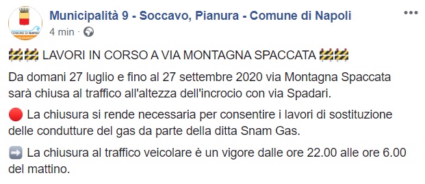 Questo quanto apprendiamo dalla pagina facebook della "Municipalità 9 - Soccavo, Pianura - Comune di Napoli":