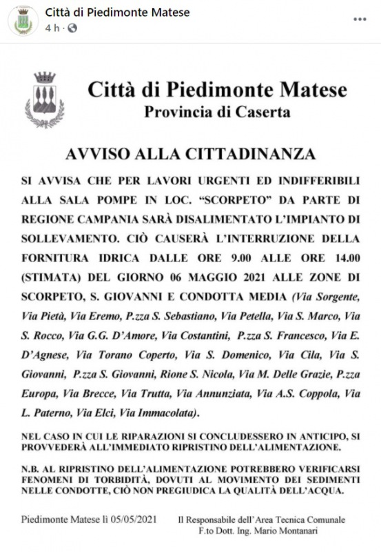 Questo quanto apprendiamo dalla pagina facebook del Comune di Piedimonte Matese: