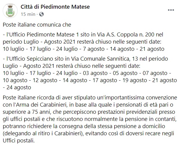 "Poste italiane comunica che - l'Ufficio Piedimonte Matese 1 sito in Via A.S. Coppola n. 200 nel periodo Luglio - Agosto 2021 resterà chiuso nelle seguenti date: 10 luglio - 17 luglio - 24 luglio - 7 agosto - 14 agosto - 21 agosto - l'Ufficio Sepicciano sito- si legge nella nota- in Via Comunale Sannitica, 13 nel periodo Luglio - Agosto 2021 resterà chiuso nelle seguenti date: 10 luglio - 17 luglio - 24 luglio - 03 agosto - 05 agosto - 07 agosto - 10 agosto - 12 agosto - 14 agosto - 17 agosto - 19 agosto - 21 agosto - 24 agosto Poste italiane ricorda di aver stipulato un'importantissima convenzione con l'Arma dei Carabinieri, in base alla quale i pensionati di età pari o superiore a 75 anni, che percepiscono prestazioni previdenziali presso gli uffici postali e che riscuotono normalmente la pensione in contanti, potranno richiedere- si legge nella nota- la consegna della stessa pensione a domicilio (delegando al ritiro i Carabinieri), evitando così di doversi recare negli Uffici postali."