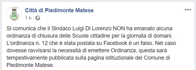 Questo quanto apprendamo dal Comune di Piedimonte Matese
