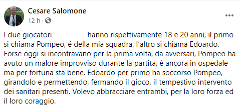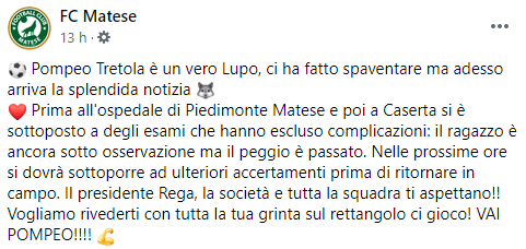 Attimi di paura, ieri a Piedimonte Matese, durante la partita di calcio valevole per il girone F di serie D tra i biancoverdi locali e la Vastese. A raccontare l'episodio, il team principal del club matesino Cesare Salomone con un post sulla sua pagina Facebook che in parte, di seguito riportiamo: "I due giocatori (...) hanno rispettivamente 18 e 20 anni, il primo si chiama Pompeo, é della mia squadra, l’altro si chiama Edoardo. Forse oggi si incontravano per la prima volta, da avversari, Pompeo - si legge nel post - ha avuto un malore improvviso durante la partita, è ancora in ospedale ma per fortuna sta bene. Edoardo per primo ha soccorso Pompeo, girandolo e permettendo, fermando il gioco, il tempestivo intervento dei sanitari presenti. Volevo abbracciare - conclude il post - entrambi, per la loro forza ed il loro coraggio". Dopo il primo soccorso ad opera del calciatore della Vastese il giovane atleta del Matese, Pompeo Tretola, come apprendiamo dalla pagina Facebook del Matese F.c. è stato trasportato in ospedale, prima a Piedimonte, poi a Caserta dove è stato sottoposto ad accertamenti che per fortuna hanno dato esito negativo: "Pompeo Tretola - si legge nel post pubblicato dal Matese - è un vero Lupo, ci ha fatto spaventare ma adesso arriva la splendida notizia. Prima all'ospedale di Piedimonte Matese - si legge - e poi a Caserta si è sottoposto a degli esami che hanno escluso complicazioni: il ragazzo è ancora sotto osservazione ma il peggio è passato. Nelle prossime ore si dovrà sottoporre ad ulteriori accertamenti prima di ritornare in campo. Il presidente Rega - conclude il post - la società e tutta la squadra ti aspettano!! Vogliamo rivederti con tutta la tua grinta sul rettangolo ci gioco! VAI POMPEO!!!!".