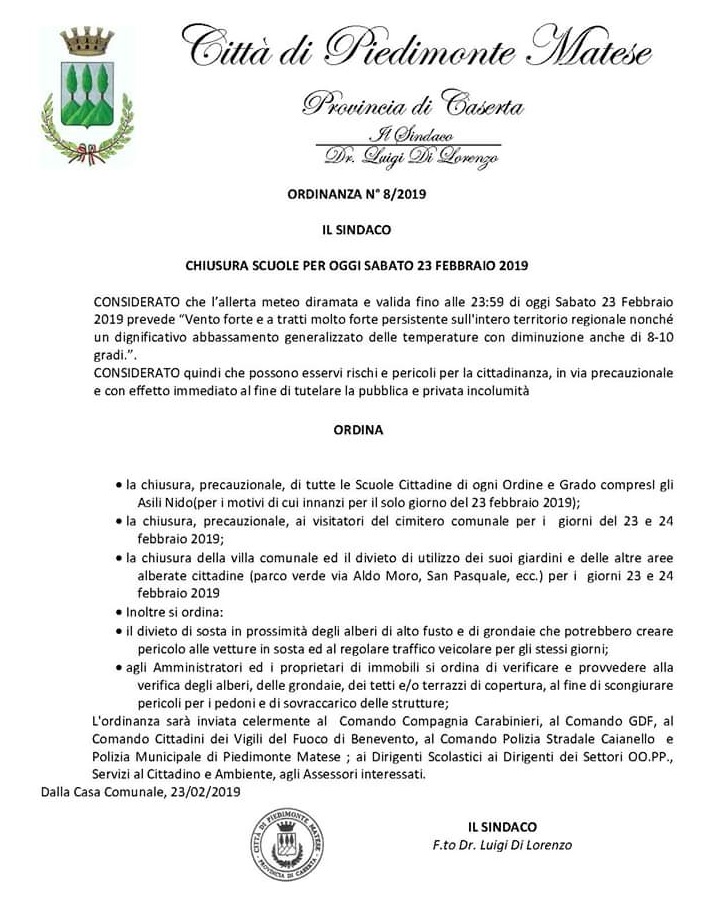 E' arrivata l'ordinanza del Comune di Piedimonte Matese che stabilisce la chiusura del cimitero e dei parchi sia per la giornata odierna che per domani, domenica 24 febbraio.