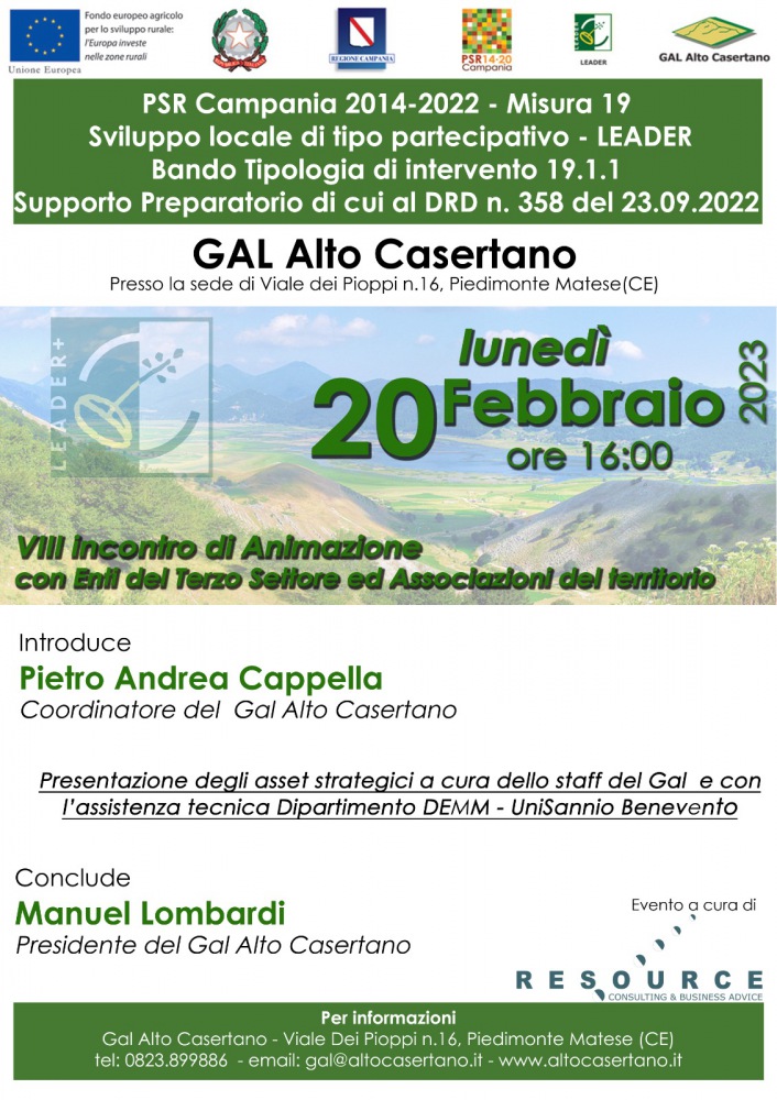 Il volontariato e la promozione delle ricchezze locali da parte degli Enti del Terzo Settore, la valorizzazione e la diffusione delle tradizioni e delle peculiarità del territorio a cura delle Associazioni locali, l’impegno civico e la voglia di essere protagonisti del loro tempo che quotidianamente profondono i ragazzi e le ragazze dei Forum Comunali dei Giovani dell’area Gal, saranno questi i tre segmenti sociali - continua - con i quali il Gruppo di Azione Locale dell’Alto Casertano si relazionerà nel doppio incontro di animazione in agenda per lunedì 20 febbraio, nella nuova sede di viale dei Pioppi a Piedimonte Matese.
