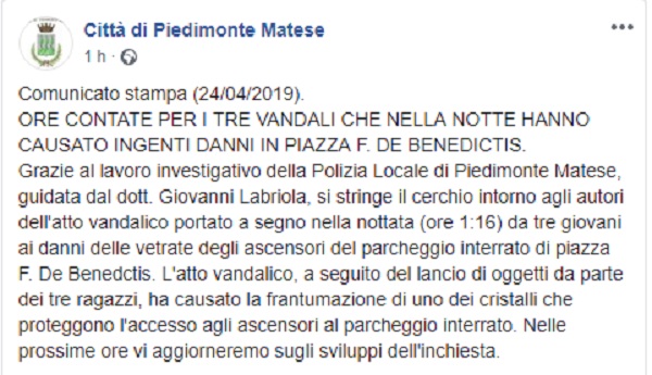 Questo il post pubblicato sulla pagina fb ufficiale della 'Città di Piedimonte Matese'