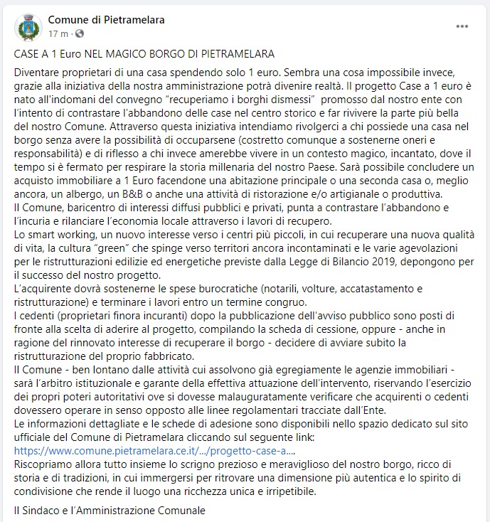 Questo quanto pubblicato sulla pagina fb del Comune di Pietramelara: "CASE A 1 Euro NEL MAGICO BORGO DI PIETRAMELARA Diventare proprietari di una casa spendendo solo 1 euro. Sembra una cosa impossibile invece, grazie alla iniziativa della nostra amministrazione - si legge nella nota - potrà divenire realtà. Il progetto Case a 1 euro è nato all'indomani del convegno “recuperiamo i borghi dismessi” promosso dal nostro ente con l’intento di contrastare l’abbandono delle case nel centro storico e far rivivere la parte più bella del nostro Comune. Attraverso questa iniziativa intendiamo rivolgerci a chi possiede una casa nel borgo senza avere la possibilità di occuparsene (costretto comunque a sostenerne oneri e responsabilità) e di riflesso a chi invece amerebbe vivere in un contesto magico, incantato, dove il tempo si è fermato per respirare la storia millenaria del nostro Paese. Sarà possibile concludere un acquisto immobiliare a 1 Euro facendone una abitazione principale o una seconda casa o, meglio ancora, un albergo, un B&B o anche una attività di ristorazione e/o artigianale o produttiva. Il Comune, baricentro di interessi diffusi pubblici e privati - si legge nella nota -, punta a contrastare l’abbandono e l’incuria e rilanciare l’economia locale attraverso i lavori di recupero. Lo smart working, un nuovo interesse verso i centri più piccoli, in cui recuperare una nuova qualità di vita, la cultura “green” che spinge verso territori ancora incontaminati e le varie agevolazioni per le ristrutturazioni edilizie ed energetiche previste dalla Legge di Bilancio 2019, depongono per il successo del nostro progetto. L’acquirente dovrà sostenerne le spese burocratiche (notarili, volture, accatastamento e ristrutturazione) e terminare i lavori entro un termine congruo. I cedenti (proprietari finora incuranti) dopo la pubblicazione dell’avviso pubblico sono posti di fronte alla scelta di aderire al progetto, compilando la scheda di cessione, oppure - anche in ragione del rinnovato interesse di recuperare il borgo - decidere di avviare subito la ristrutturazione del proprio fabbricato. Il Comune - ben lontano dalle attività cui assolvono già egregiamente le agenzie immobiliari - sarà l’arbitro istituzionale e garante della effettiva attuazione dell’intervento, riservando l’esercizio dei propri poteri autoritativi ove si dovesse malauguratamente verificare che acquirenti o cedenti dovessero operare in senso opposto alle linee regolamentari tracciate dall’Ente. Le informazioni dettagliate e le schede di adesione - si legge nella nota - sono disponibili nello spazio dedicato sul sito ufficiale del Comune di Pietramelara cliccando QUI. Riscopriamo allora tutto insieme lo scrigno prezioso e meraviglioso del nostro borgo, ricco di storia e di tradizioni, in cui immergersi per ritrovare una dimensione più autentica e lo spirito di condivisione che rende il luogo una ricchezza unica e irripetibile. Il Sindaco e l’Amministrazione Comunale"