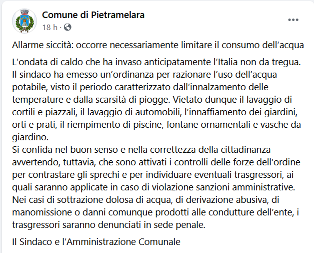 Questo il post pubblicato sulla pagina Facebook del Comune di Pietramelara: "L’ondata di caldo che ha invaso anticipatamente l’Italia non da tregua. Il sindaco ha emesso un’ordinanza per razionare l’uso dell’acqua potabile, visto il periodo caratterizzato dall’innalzamento delle temperature e dalla scarsità di piogge. Vietato dunque - si legge nel post - il lavaggio di cortili e piazzali, il lavaggio di automobili, l’innaffiamento dei giardini, orti e prati, il riempimento di piscine, fontane ornamentali e vasche da giardino. Si confida - continua il post - nel buon senso e nella correttezza della cittadinanza avvertendo, tuttavia, che sono attivati i controlli delle forze dell’ordine per contrastare gli sprechi e per individuare eventuali trasgressori, ai quali saranno applicate in caso di violazione sanzioni amministrative. Nei casi - conclude il post - di sottrazione dolosa di acqua, di derivazione abusiva, di manomissione o danni comunque prodotti alle condutture dell’ente, i trasgressori saranno denunciati in sede penale".