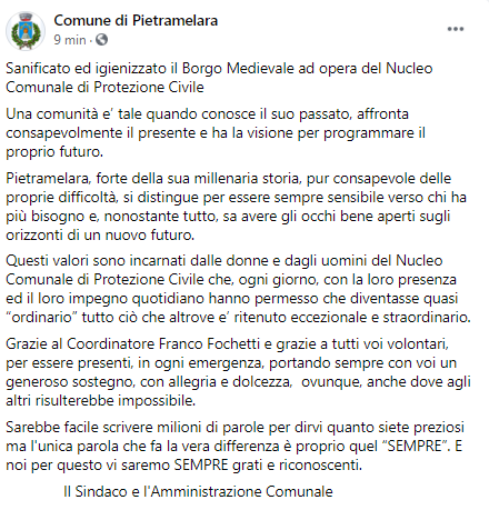 Questo il post pubblicato sulla pagina Facebook 'Comune di Pietramelara': "Sanificato ed igienizzato il Borgo Medievale ad opera del Nucleo Comunale di Protezione Civile. Una comunità e’ tale quando conosce il suo passato, affronta consapevolmente il presente e ha la visione per programmare il proprio futuro. Pietramelara, forte della sua millenaria storia, - si legge nel post - pur consapevole delle proprie difficoltà, si distingue per essere sempre sensibile verso chi ha più bisogno e, nonostante tutto, sa avere gli occhi bene aperti sugli orizzonti di un nuovo futuro. Questi valori sono incarnati dalle donne e dagli uomini del Nucleo Comunale di Protezione Civile che, ogni giorno, con la loro presenza ed il loro impegno quotidiano - prosegue il post - hanno permesso che diventasse quasi “ordinario” tutto ciò che altrove e’ ritenuto eccezionale e straordinario. Grazie al Coordinatore Franco Fochetti e grazie a tutti voi volontari, per essere presenti, in ogni emergenza, portando sempre con voi - si legge ancora nel post - un generoso sostegno, con allegria e dolcezza, ovunque, anche dove agli altri risulterebbe impossibile. Sarebbe facile scrivere milioni di parole per dirvi quanto siete preziosi ma l'unica parola che fa la vera differenza è proprio quel “SEMPRE”. E noi per questo conclude - il post - vi saremo SEMPRE grati e riconoscenti. Il Sindaco e l'Amministrazione Comunale"