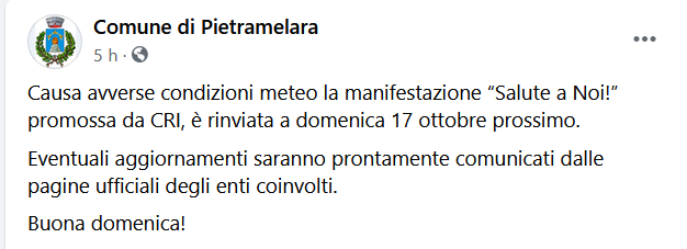 Questo il post pubblicato sulla pagina Facebook del Comune di Pietramelara: "Causa avverse condizioni meteo la manifestazione “Salute a Noi!” promossa da CRI, è rinviata a domenica 17 ottobre prossimo. Eventuali aggiornamenti - si legge nel post - saranno prontamente comunicati dalle pagine ufficiali degli enti coinvolti. Buona domenica!".