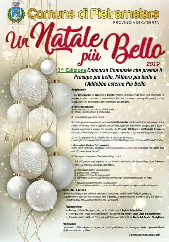 "Domenica 12 gennaio 2020 alle ore 11:00 presso la sala consiliare del Comune di Pietramelara avverrà la premiazione del concorso “Un Natale Più Bello” alla presenza del sindaco e dell’amministrazione comunale. Nell’ambito della premiazione saranno consegnate delle targhe, in segno di gratitudine e di riconoscenza, a quanti si sono adoperati per la riuscita di un Natale autentico e coinvolgente!"