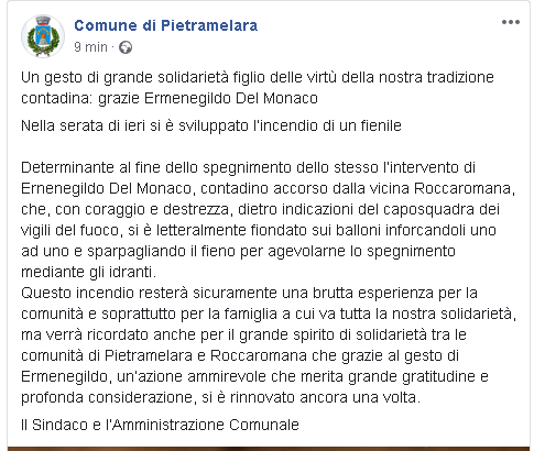 Nella serata di ieri si è sviluppato l’incendio di un fienile .... Determinante al fine dello spegnimento dello stesso l’intervento di Ernenegildo Del Monaco, contadino accorso dalla vicina Roccaromana, che, con coraggio e destrezza, dietro indicazioni del caposquadra dei vigili del fuoco, si è letteralmente fiondato sui balloni inforcandoli uno ad uno e sparpagliando il fieno per agevolarne lo spegnimento mediante gli idranti. Questo incendio resterà sicuramente una brutta esperienza per la comunità e soprattutto per la famiglia a cui va tutta la nostra solidarietà, ma verrà ricordato anche per il grande spirito di solidarietà tra le comunità di Pietramelara e Roccaromana che grazie al gesto di Ermenegildo, un’azione ammirevole che merita grande gratitudine e profonda considerazione, si è rinnovato ancora una volta."