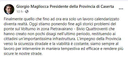 Lo apprendiamo dalla pagina Facebook del Presidente della Provincia di Terra di Lavoro Giorgio Magliocca