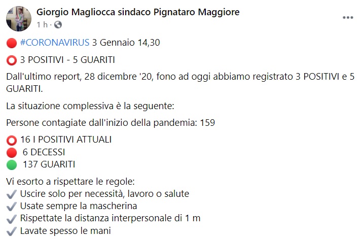 Questo quanto apprendiamo dalla pagina facebook del Sindaco Magliocca: