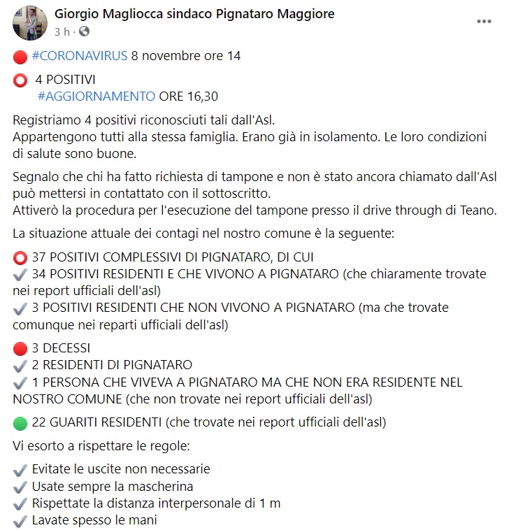 Questo quanto apprendiamo dalla pagina facebook del Sindaco Magliocca.