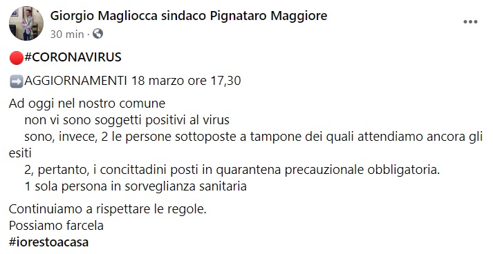 Questo quanto appreso dalla pagina facebook del Sindaco Magliocca: